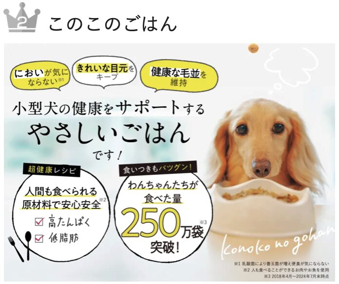 フレンチブルドッグ専用ドッグフードおすすめ第2位は、愛犬の健康と食いつきにこだわって作られた『このこのごはん』です。