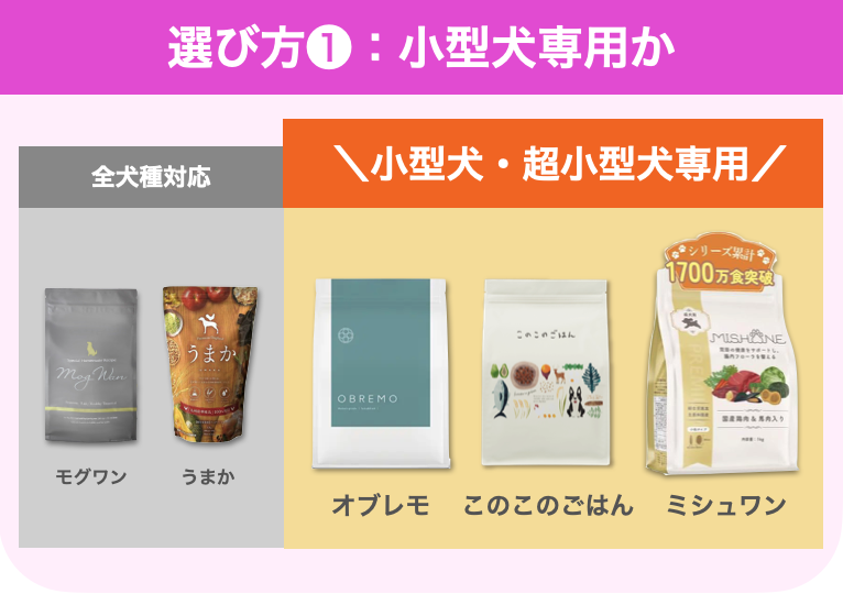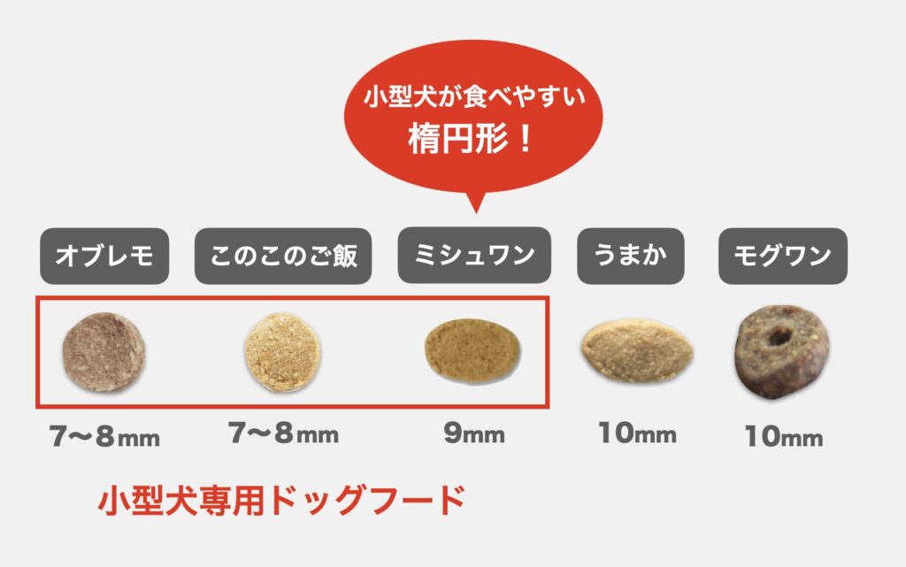 | 小型犬 ドッグフード | ![]() ミシュワン | ![]() このこのごはん | ![]() オブレモ | ![]() モグワン | ![]() うまか |