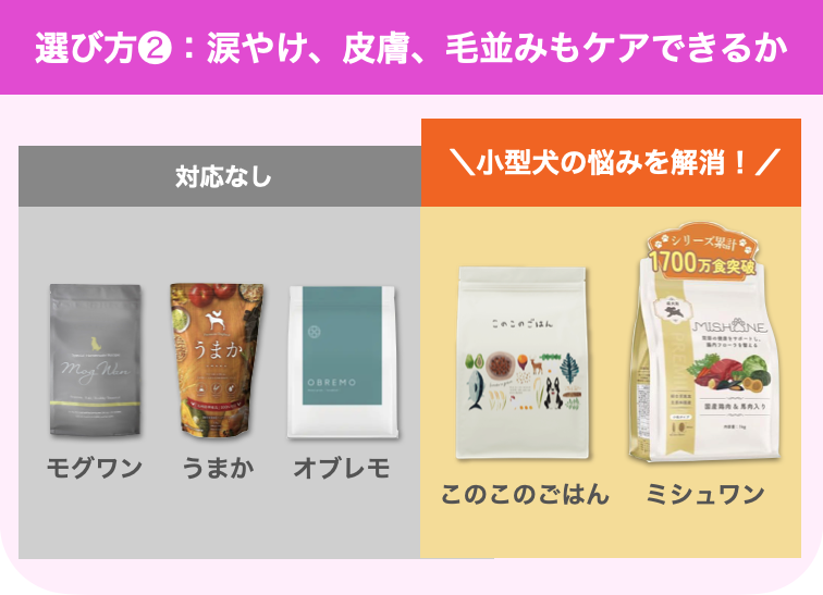| 涙やけ・皮膚・毛並み・関節ケア | 小型犬の悩みを 全て徹底ケアできる | ケアできる | 対応なし | 対応なし | 対応なし |