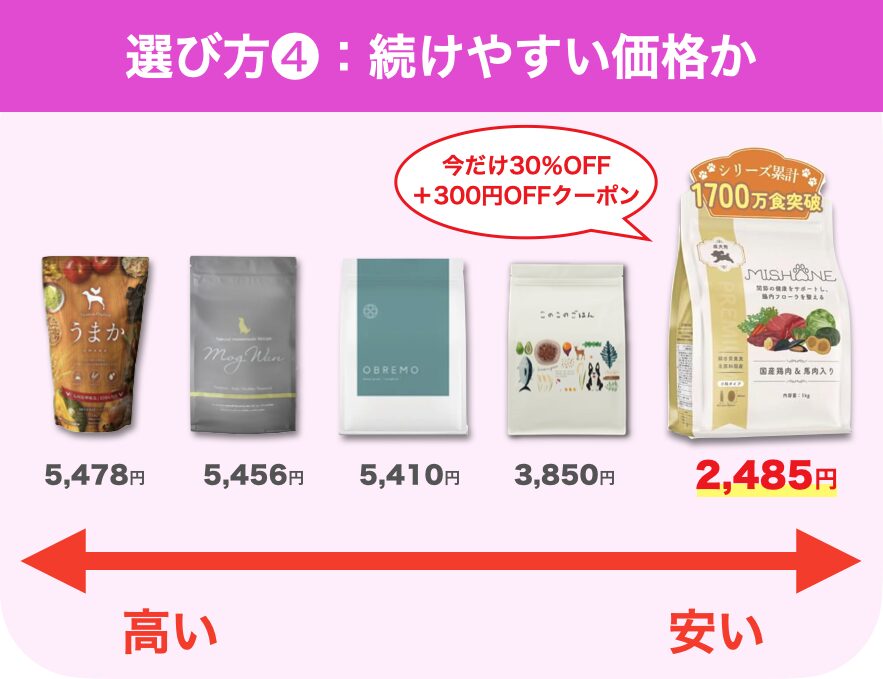 どんなに良いドッグフードでも、毎月ムリなく続けられる価格かどうかはとても大切です。