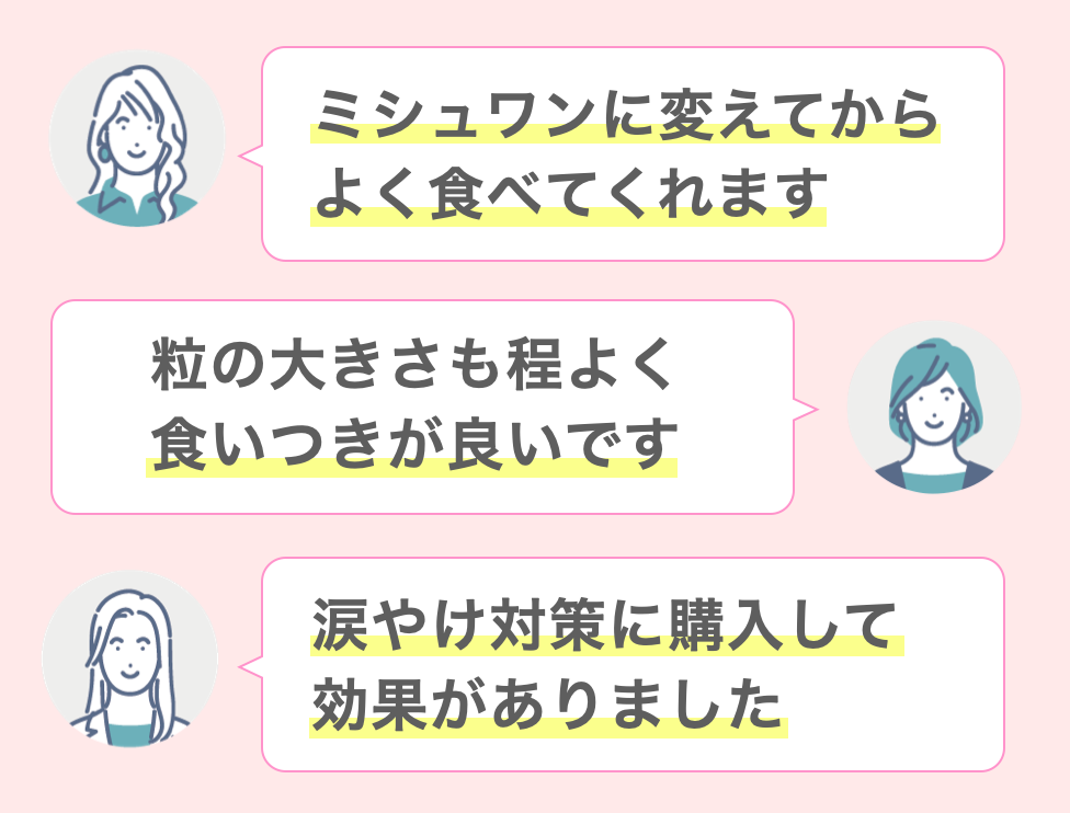 特に、食欲が落ちていたワンちゃんや、他のフードに飽きていた子も、ミシュワンに替えた途端に食欲が戻ったという声が多いです。